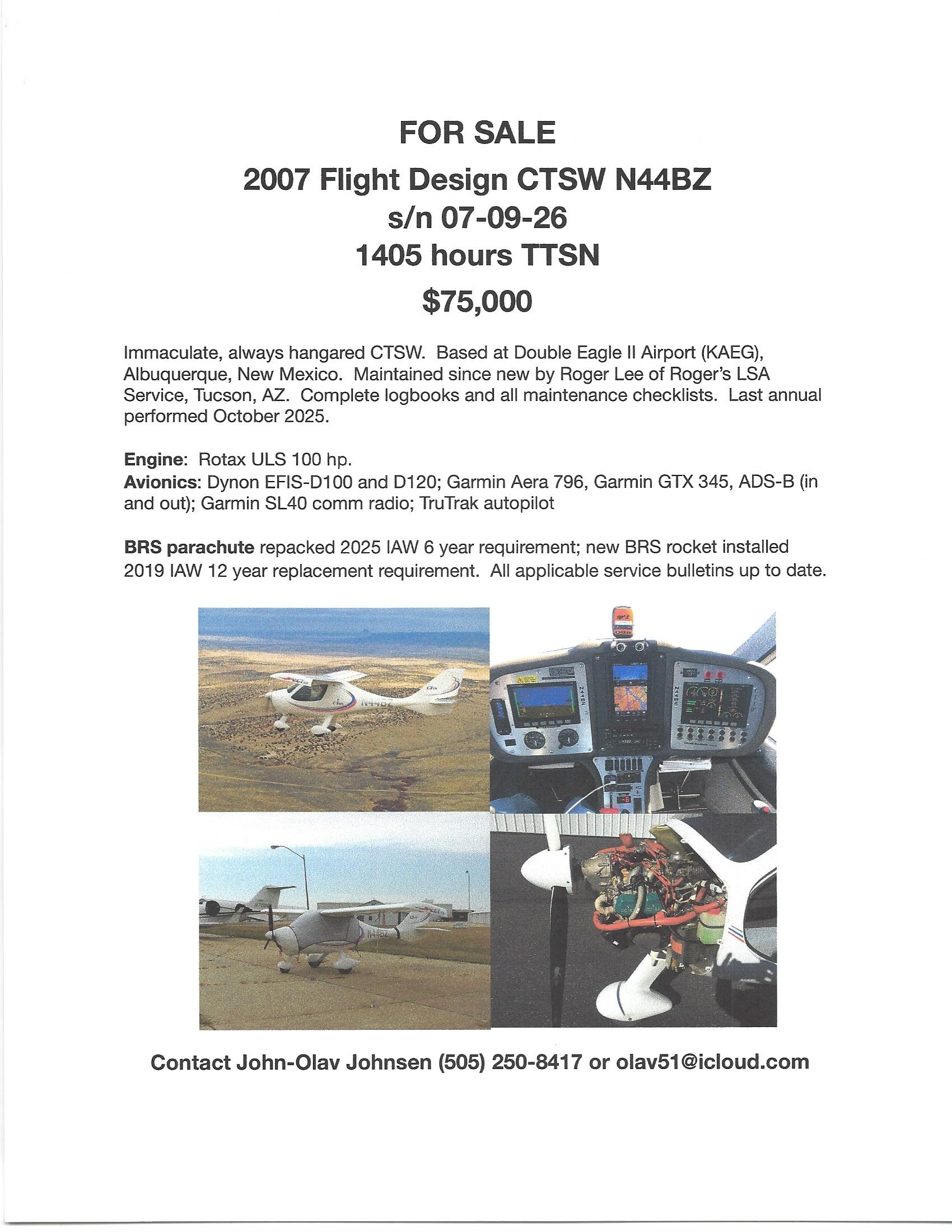 Immaculate, always hangared CTSW. Based at Double Eagle II Airport (KAEG), Albuquerque, New Mexico. Maintained since new by Roger Lee of Roger’s LSA Service, Tucson, AZ. Complete logbooks and all maintenance checklists. Last annual performed October 2025. Engine: Rotax ULS 100 hp. Avionics: Dynon EFIS-D100 and D120; Garmin Aera 796, Garmin GTX 345, ADS-B (in and out); Garmin SL40 comm radio; TruTrak autopilot BRS parachute repacked 2025 IAW 6 year requirement; new BRS rocket installed 2019 IAW 12 year replacement requirement. All applicable service bulletins up to date.